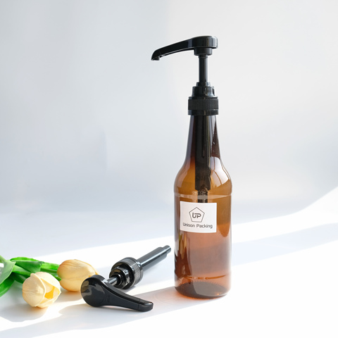 Bomba de plástico de prensa de jarabe 28/400 28/410 personalizable de grado alimenticio con botella de jarabe